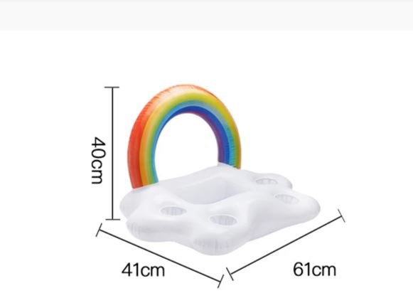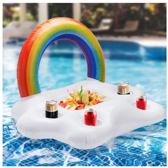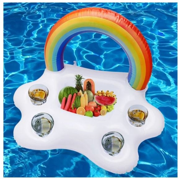 מגש צף בעיצוב מרהיב של קשת בענן צבעונית, המותאם לאחסון שתייה ומזון.