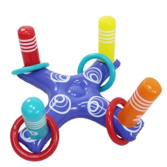 הכירו את המתנפח החדשני המותאם למשחק במים או בחוץ, משחק השחלת הטבעות המתנפח, בעל 4 יתדות ו-4 מטבעות.