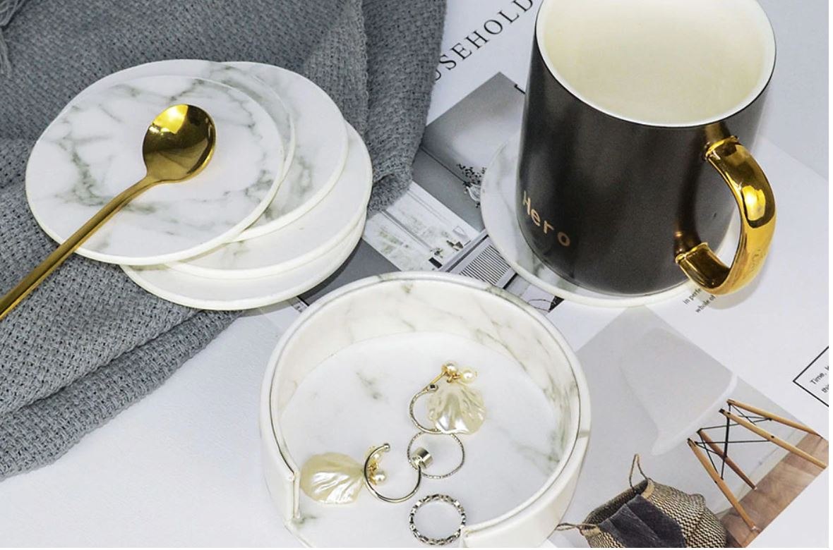 6 תחתיות דמוי שיש+מעמד מאגד בעיצוב תואם.